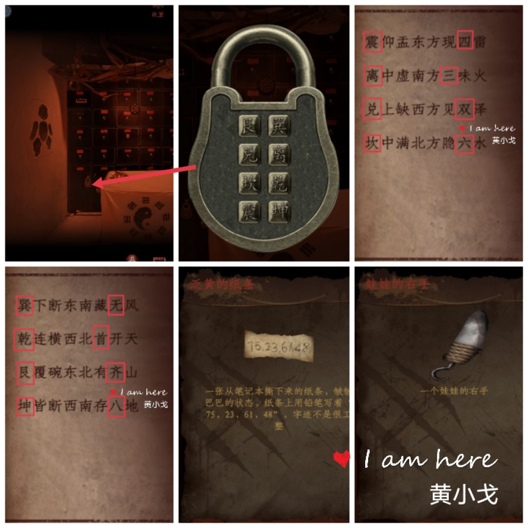 11.点击柜子的八卦锁,根据【八卦口诀】上的信息:震四、离三 、兑二、坎六、巽五、乾一(首就是一)、艮七、坤八,和【泛黄的纸条】上的信息:75236148,得出顺序:艮巽兑离坎乾震坤,获得【娃娃的右手】