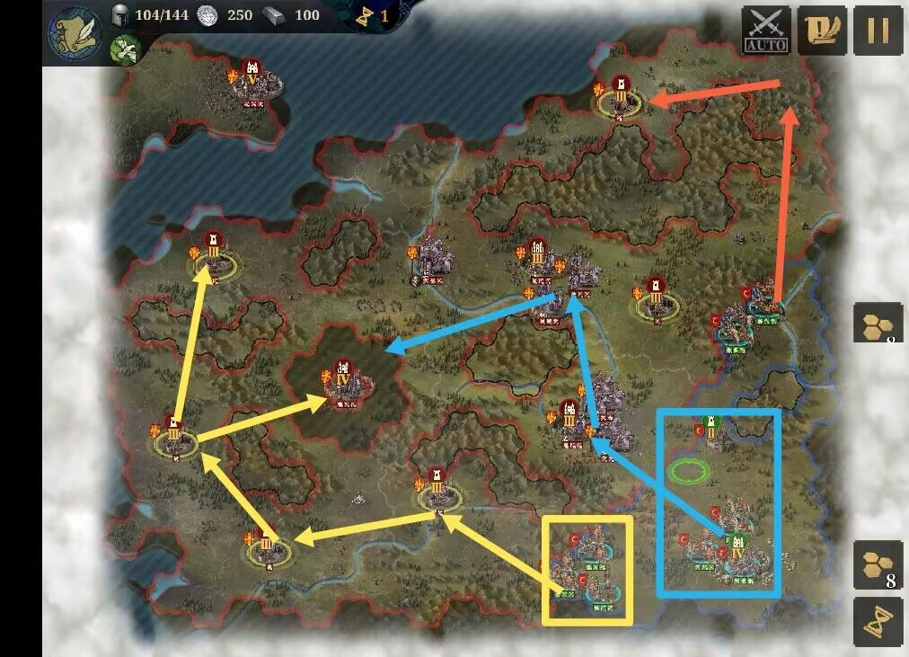 ②黄线为第二梯队行军路线,拿下中间三级红圈城,随后分兵驻守,并让绿圈去突袭左上红圈城