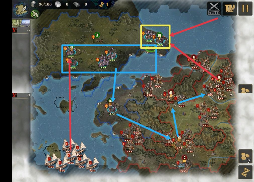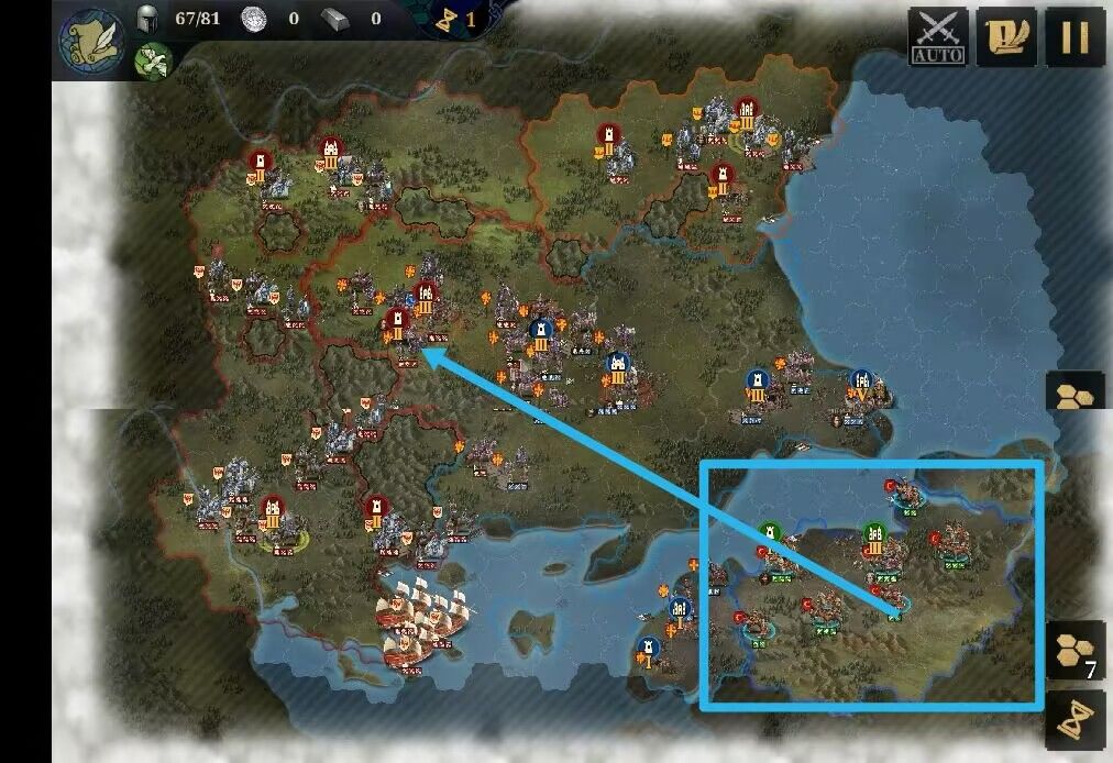 ①蓝线为主力行军路线,迅速渡过海峡,拿下中间四级城,并在此抵御敌方的进攻,待敌方势弱后,拿下右上三级城