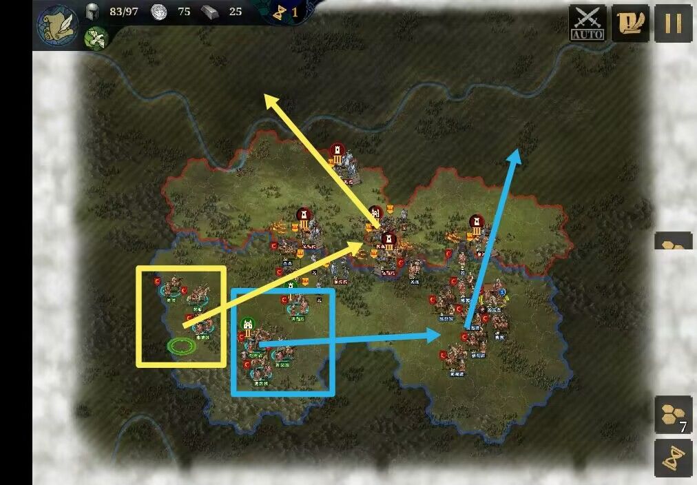 蓝线为所有部队行军路线,直接强行进攻红圈城,不要去管黄圈城,占领红圈即可获得胜利