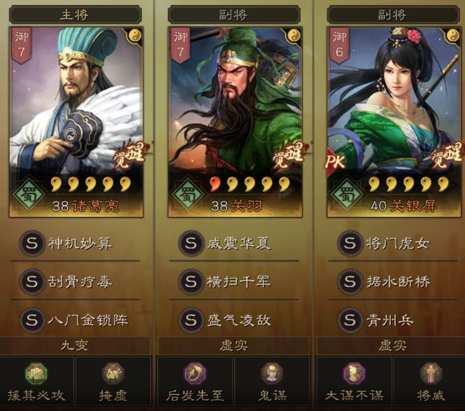 总结:讲道理了,父女枪的玩法里,SP诸葛亮的契合度肯定是高于老诸葛的,毕竟关羽和关妹自带战法都可以通过SP诸葛亮更好的得到触发,否则关羽的确很容易出现演戏的问题,关妹战法触发后也更容易打出控制链!当然了,SP诸葛亮并不好抽,如果有的话可以直接安排上,对战胜率会有比较明显的提升,战法方面的话可以保持现状或者根据自己的理解进行微调整,刮骨疗毒可以换婴城坐守整装待发等!