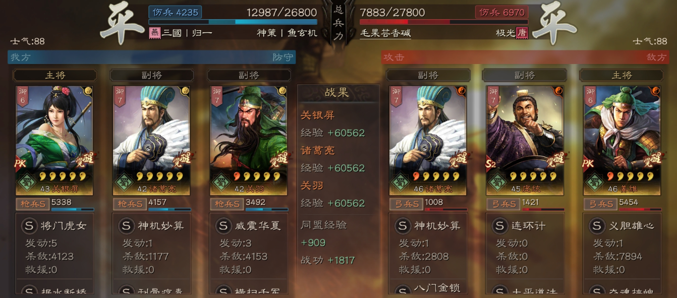 低战损赢下孙权吴骑,基本上盛气凌敌缴械到太史慈和孙权就稳赢了,这也是为什么即便关羽演戏,只用了几百战损就赢下对面的原因。