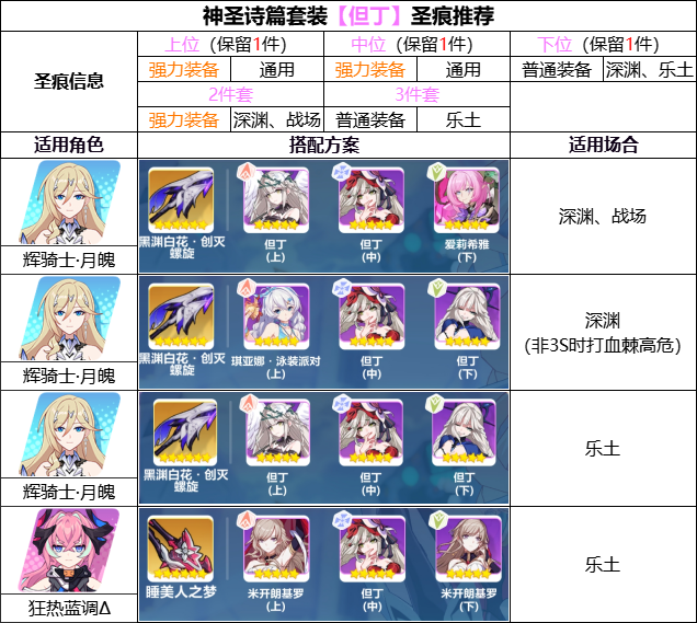 [但丁](上+中)+[爱莉希雅](下)为'辉骑士·月魄'在深渊和战场的常用输出圣痕,战场中根据实际情况可能会有其他圣痕组合。