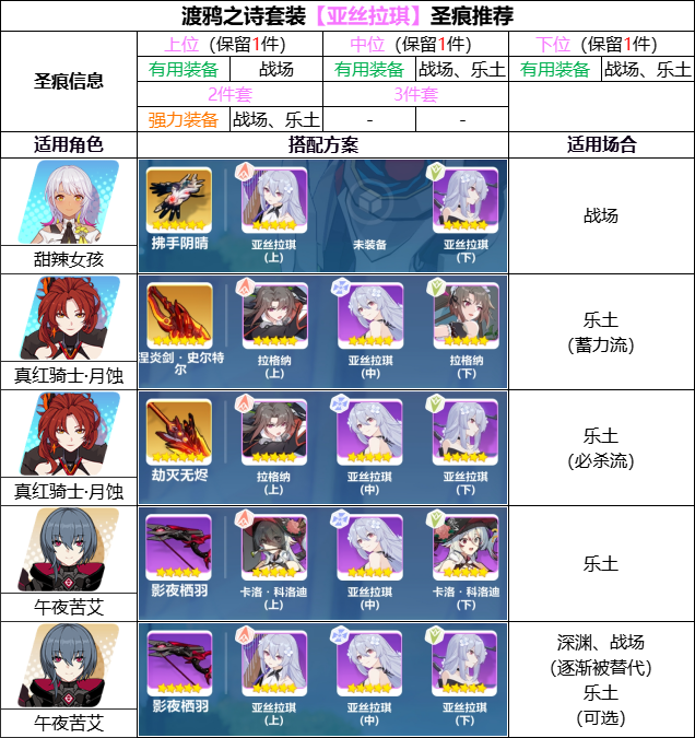 [亚丝拉琪]一套为'午夜苦艾'的推荐圣痕,'午夜苦艾'本身和圣痕都较为依赖必杀技来提供辅助加成效果,与圣痕效果非常契合。因为本身续航问题,所以词缀方面尽可能提高续航效果。