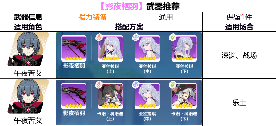 [影夜栖羽]为'午夜苦艾'的毕业武器,被动技能增加全队火元素伤害,主动技能命中敌人后使得全队每人获得3次攻击的额外火元素伤害。