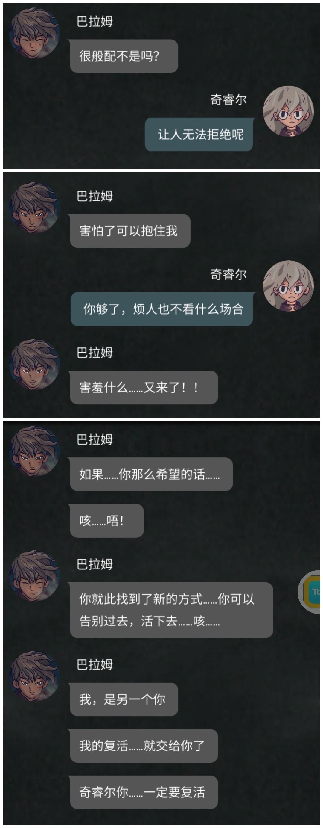 总之,这款游戏值得推荐,玩的时候要有耐心,带有自己的思考。嗷嗷嗷还想起来巴拉姆跟奇睿尔真的好磕啊(以奉上图)