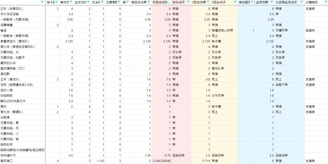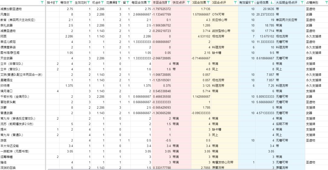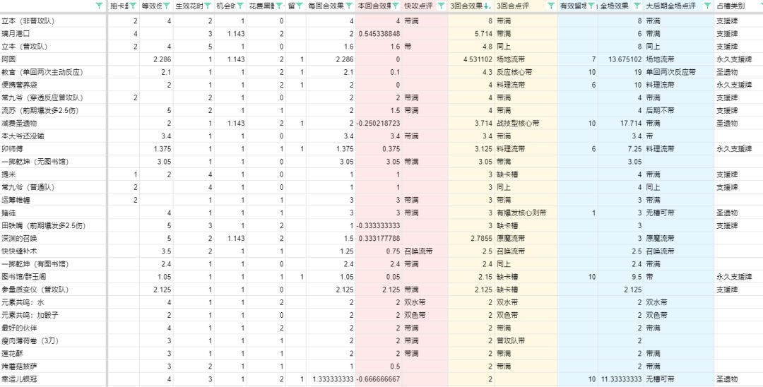 中速卡组的重要任务就是克制快攻,按照30血/2性价比=15白骰子来算,需要在2回合内完成对快攻的反超,所以这里计算了2回合内的卡牌收益并排序,收益稳定在前30名的已经在黄色区域标上带满。双同色骰子用二项分布算得概率是固定颜色出现单色骰子的1.143倍,三同色骰子是2.286,这些当作机会成本,以减少效果生效的时间。一般阿圆和便携营养袋料理流二选一以用高回复拖住快攻,今天的瓦娘已经推荐料理流来克制自己的快攻了,这里的计算更偏向于阿圆场地流。反正能防住快攻就是值的嘛,怎么能说他骗尘瓦呢。拖住之后用什么来确保自己比快攻更长线的优势呢?那就是更多的抽卡以及给核心带上圣遗物和武器了。至于OTK可以减少场地流组件、增加OTK组件。目前我用这套中速卡组换了几个角色都是对快攻全胜。
