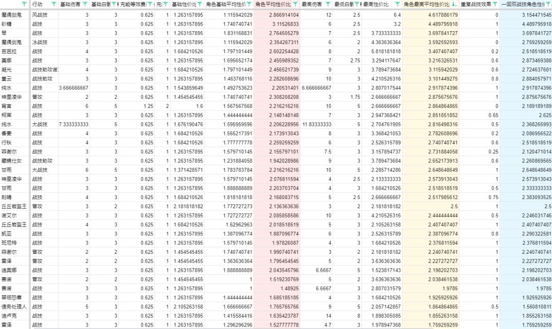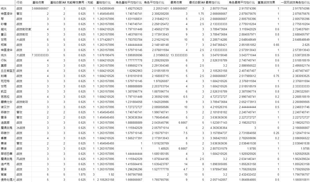 根据本文的价值模型,很容易算出全局第一次用技能时的基础性价比,按照表中的基础性价比排序,债务处理人、宵宫的战技数一数二,而按照每次战技前都用了一次流苏且不切人一直放战技直到元素爆发完全生效计算,得出角色基础平均性价比,排名前三的是迪奥娜、甘雨、琴。然而这些参考价值都很低,著名的菲谢尔和柯莱的第1回合10伤就只需要摸到柯莱的装备卡。很快就能按照全部反应都发生来计算出角色最高平均性价比,如下: