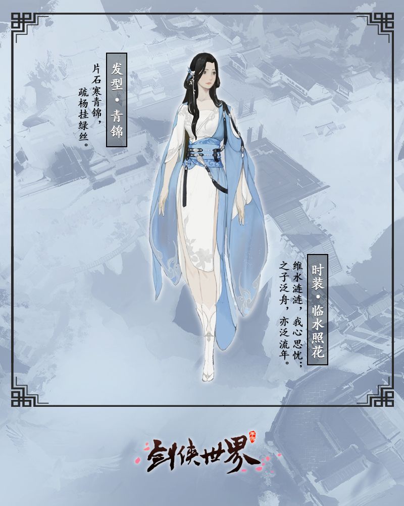 织云入双袖,锦花坠青丝。衣裙上的花纹典雅温婉,正如时装的名字,临水照花,洁白的花朵映照在温柔的涟涟水面之上。