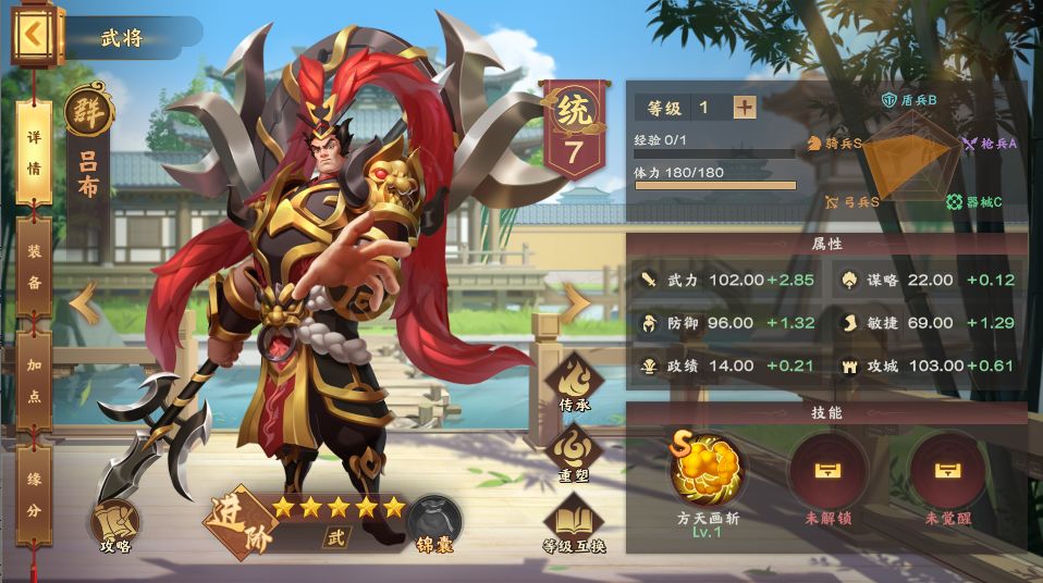 首先吕布作为本游戏的武力输出天花板,拥有着极高的武力输出属性与武力成长属性。