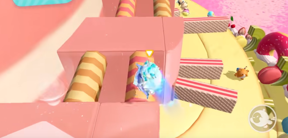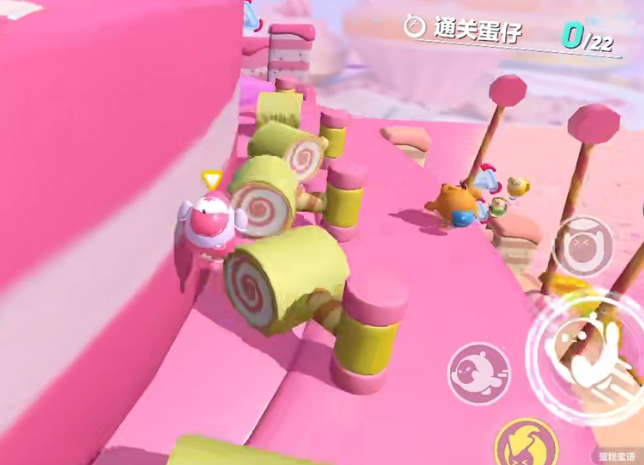 开局直接贴墙靠左走,可以顺利通过第一层的马卡龙,之后踩上弹板控制好视角就可以跳到第二层,非常的简单。到了第二层威化饼这里有两种跑法。求快的话可以看准时机贴边开滚动快速通过;求稳就跳上威化饼上一个一个越过。这里只要保证不被威化饼推下去就行了。