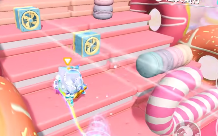 第一个蛋卷这里可以直接跳过去;第二个蛋卷表面会滑,建议跳着过去尽量减少与蛋卷的接触;第三个蛋卷一个跳扑就可以直接跳到弹板上面,控好视角直接到第四层,非常的顺滑。