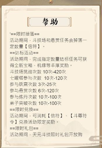 核心玩法其实就是用平时攒下来的挑战令和悬赏令,达到所要求的挑战次数以及获得斗技活动核心道具(信符:目前两次斗技使用的是同一个兑换道具信符,也就是说如有结余能到下次活动开启使用),上次还存着没用的信符在这次也可以用。新手玩家能获得多少信符就努力获得多少,在斗技活动前不久创号的萌新玩家尽量把悬赏令和挑战令留在这个活动用,收益很大。