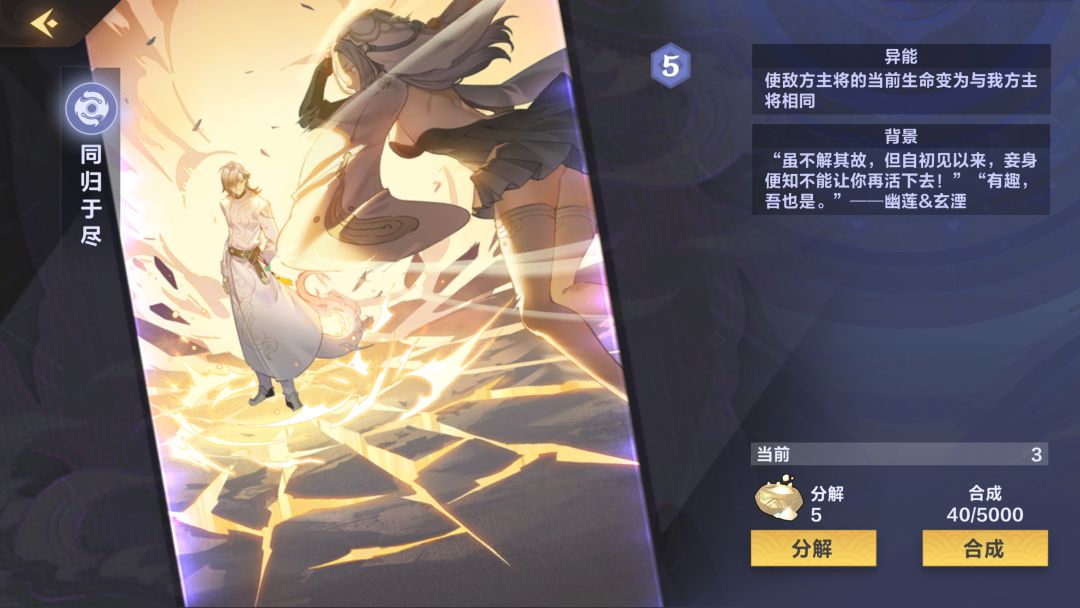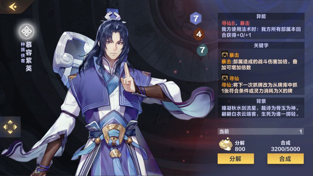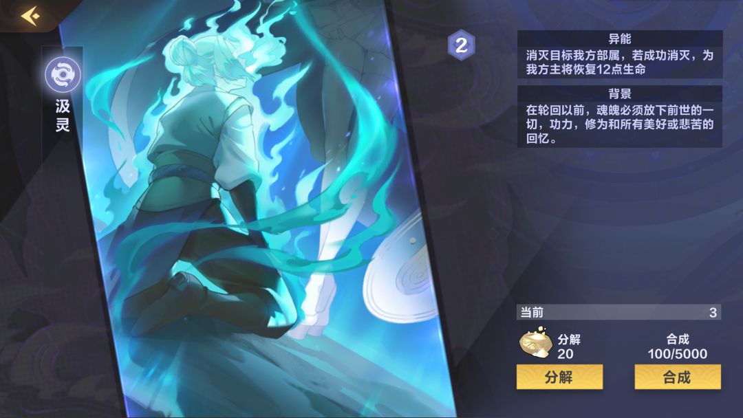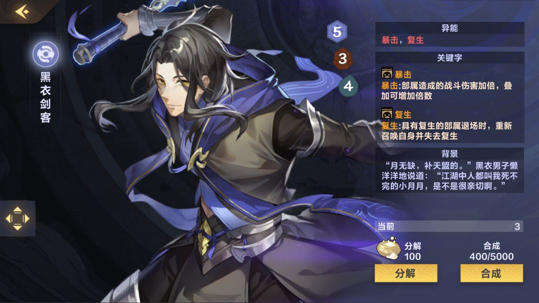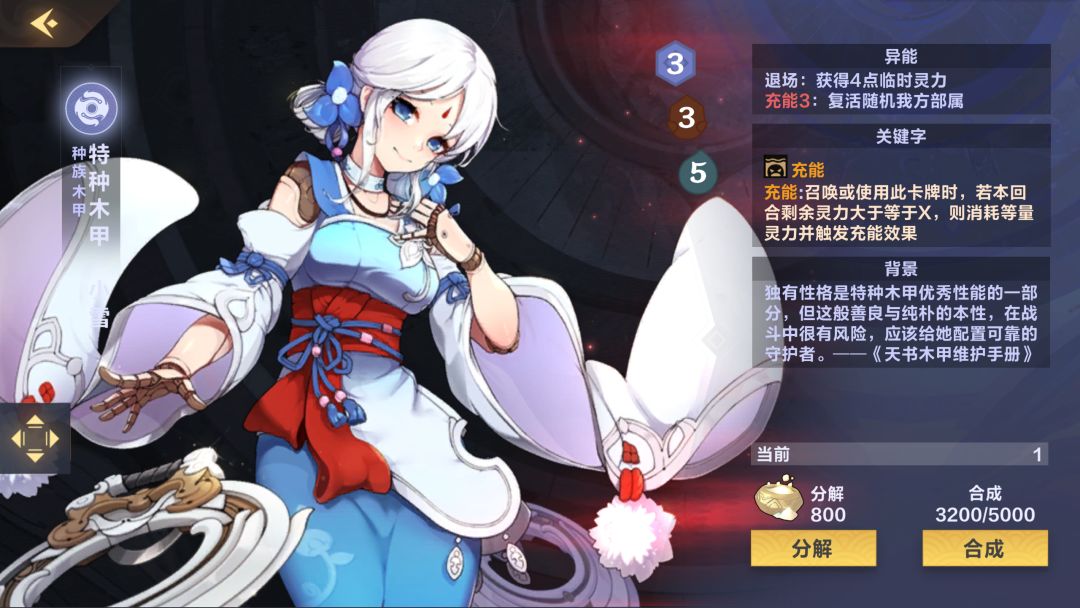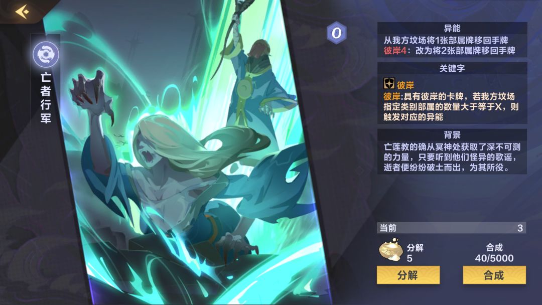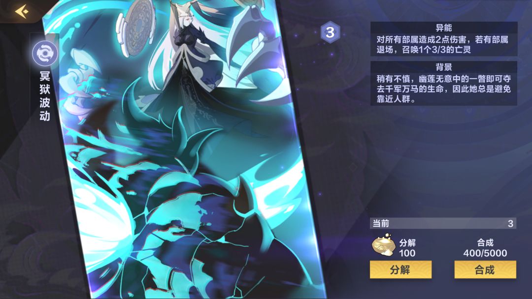(0-3张)比较推荐新人带的一张卡,可以解很多单体大哥了,而且复生也给了这张卡站场的能力,可惜与本家大姐(黑幽莲)不是很搭(暴击相当于少了4点攻击),卡全了可以抛弃此卡(6分)
