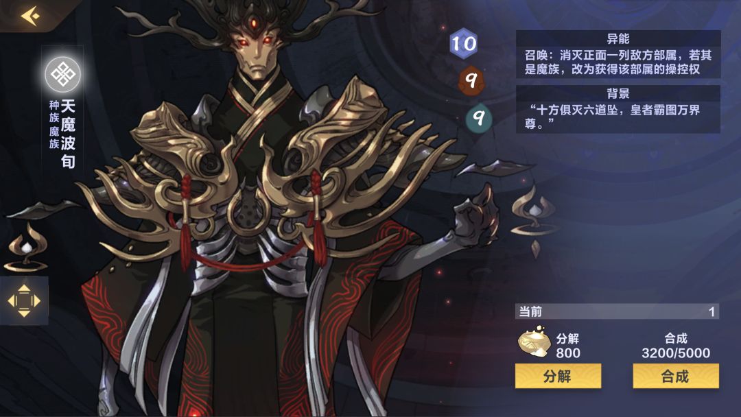 先介绍一下魔族大哥,也是因为他二周年送,又强,会让你的魔族反水,也是目前为什么我没有用魔族体系原因之一,其次也是因为女神这卡也可以解魔族,魔族阴目前强度不算太高的原因也是如此。