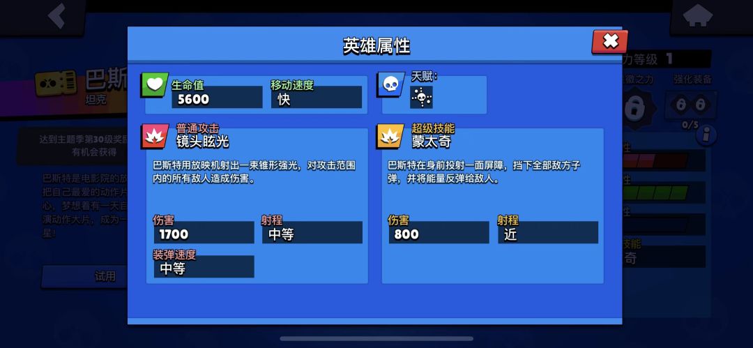 二:巴斯特攻击技能巴斯特的普通攻击-镜头炫光,扇形射出一束强光对范围内敌人造成一定的伤害!距离越近伤害越高,距离越远伤害越低。巴斯特的超级技能-蒙太奇,巴斯特在身前投射一道屏障,挡下地方所有子弹并将能量反弹给敌人,即使像普利莫、罗莎这种近战拳波也能反弹回去哦!冷知识大招开启的同时普攻还会持续的回弹,敌人耗光子弹后巴斯特又可以打出一波爆炸输出!在角色到达满11级的时候,拥有8400点基础生命值,普攻最大造成2550点伤害,最小造成1275点伤害,大招反弹1200点伤害高学量高伤害!作为坦克的巴斯特真的拥有太多了~