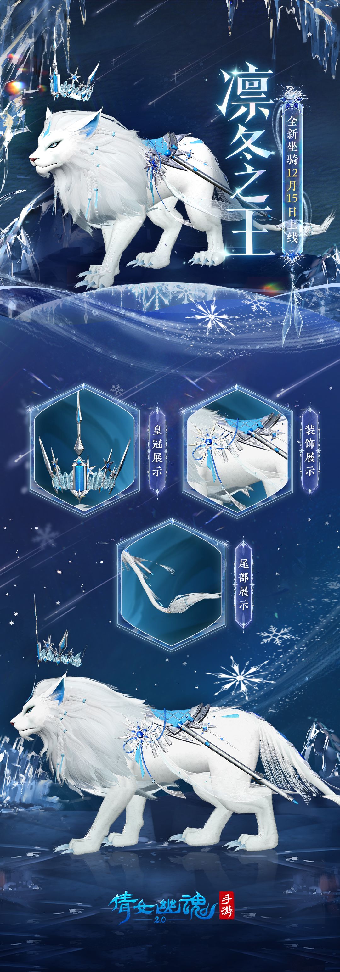 全新坐骑【凛冬之王】一改现实中凶狠的雄狮形象,白色的毛发增加了坐骑的反差萌,威严霸气的同时又凸显温顺纯良。待机时,怒目圆睁,咆哮而起,狮身周围白光笼罩,时不时有雪花缓缓飘落,好不炫酷。骑上这样一只贵气十足的雄狮行走于三界,看看谁还敢欺负菌菌!