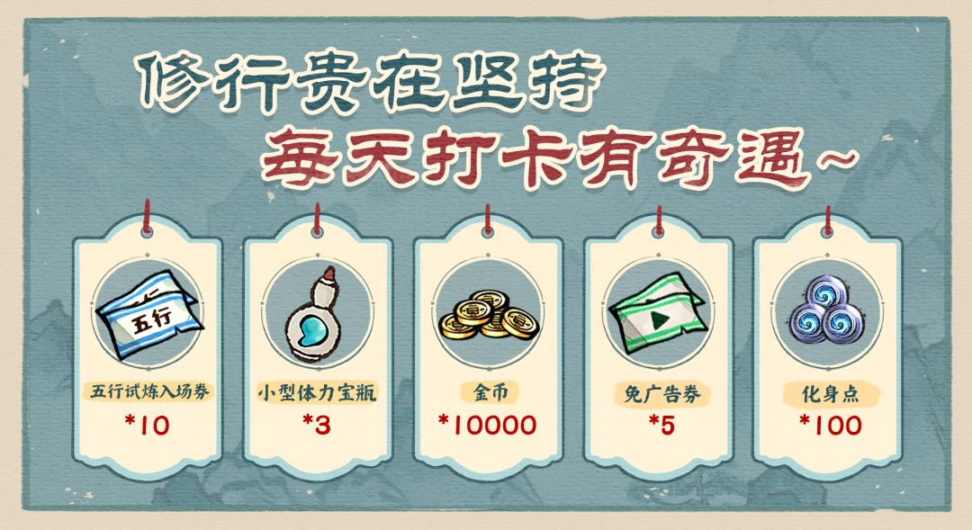 打卡玩家每超过10位,将抽取一人奖励五行试炼入场券10+小型体力宝瓶*3+铜币*10000+免广告卷*5+化身点*100