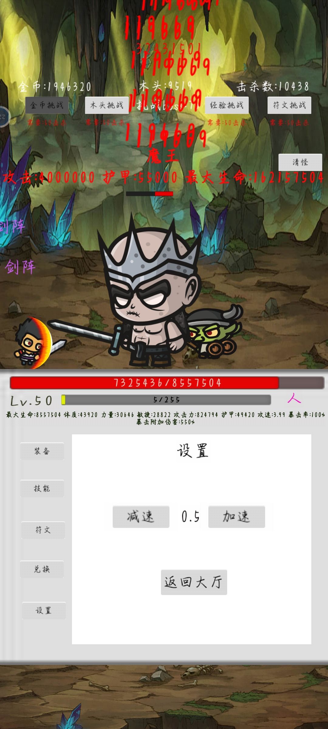 开局杀敌数加金剑。三格子换金币。鞋子。天赋高可以先开2怪。然后刷神器。神器用6魔。尽量先凑6个。凑到6个直接开7怪。然后就挂机了。