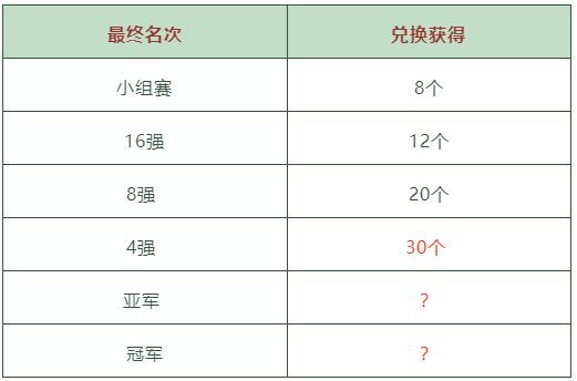 活动说明:比赛结果出来后,使用道具「队徽」兑换道具「凤尾」。最终兑换所得,将根据球队最终名次,按照比例兑换,具体详情请参考下方表格。例如:蒂娜花重金兑换「德国队徽*10」,现在德国队在小组赛惨被淘汰,蒂娜只能用「德国队徽*10」兑换「凤尾*8」。
