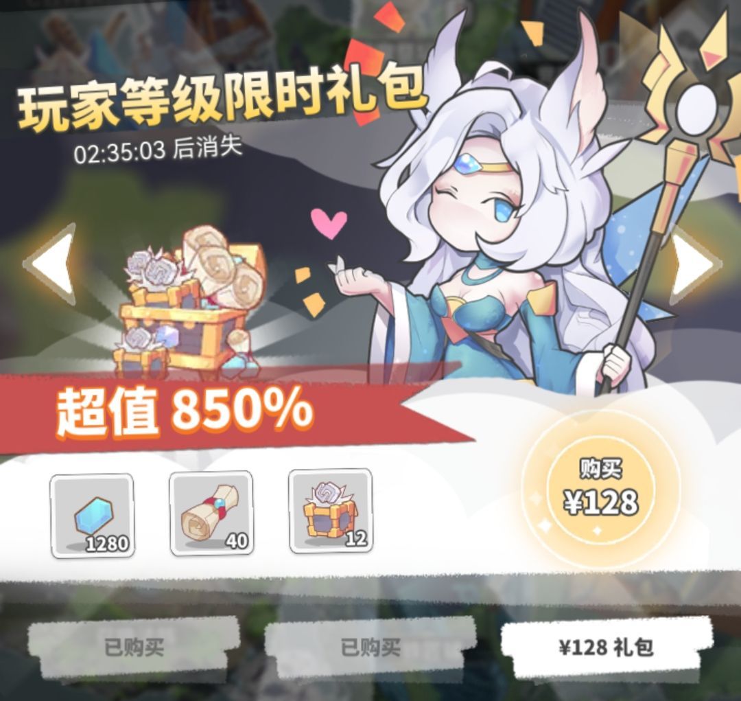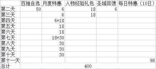 第一天消费满500,激活第二个累消套装特效,每天免费一次魔女祈愿,白嫖就要从第一天开始!前面十个礼包相信大家很容易找到,最后一个,玩家等级限时礼包,需要特别注意一下,这个弹窗礼包会在你人物等级到达12级的时候触发,而吃了贸易商会的18元人物经验礼包即可到达12级,但是别着急,触发礼包的价格是根据你触发前的消费水平以及人物等级来的,所以,我们要在触发他之前,就把自己的消费档位提上去,来诱导他出30/68/98这个档位的礼包。诚然6/18/30的性价比更高,不过资源太少,不适合我们这个档位了(手动豪横),不过有点遗憾的是这次测试只有两个区,我只试出了氪24元后触发,弹出的是6/18/30的,氪306元后触发,弹出的是68/98/128的(128的性价比太低了我没买)。不过根据这个盲猜一下,可以在吃人物经验书前,先把研究者礼包,人物经验包,双会员以及每日特惠(10日)买了,一共消费208元后再触发,应该不会错。(测试结果出来了,消费190之后触发,就可以得到30/68/98这组礼包,买研究者礼包,人物经验包,季度会员以及每日特惠(10日)即可)。钻石消费的话和百元党差不多,有区别的是,不打折的钥匙可以不买了。还有5折的可以全包了,紧缺资源7折也未尝不可。因为我们还有月度特惠的钻石,够用。圣域把暴击次数都用在最高等级的远古遗迹或者核心圣域上面,用完暴击次数之后再去刷低级的巨石和邪眼开图,有每日特惠给的钥匙,钥匙也够用的。对了,这里提一下那个12元的弹窗宝具礼包,那个我算了一下性价比不是太高,也不是太低,因为是资源类的,我就无视了,买不买自己拿主意吧。至于性价比计算,我这里举两个例子你们就可以自己算了
