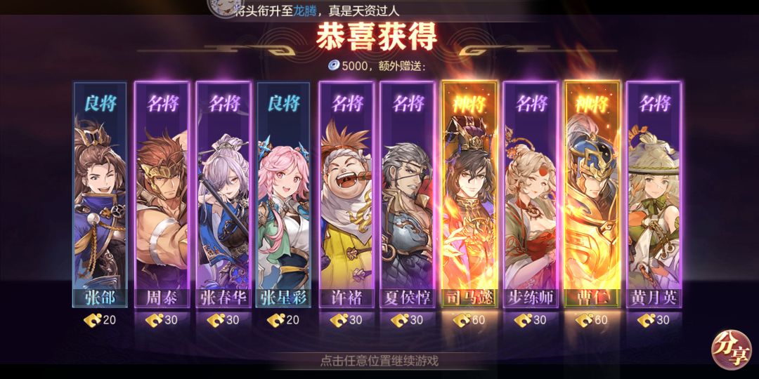 之前我一直许愿司马懿和曹仁,但是一直歪,歪马超啥的,不然就是单给曹仁,今天终于他喵的一炮双响