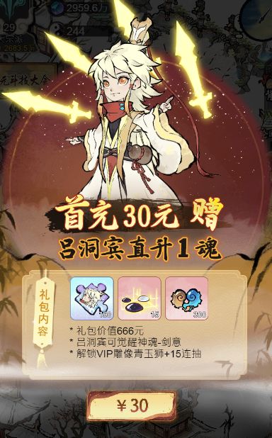 新手会有吕洞宾礼包,首充6元就可以获得轮回者吕洞宾,还赠送轮回棋子十连抽和60机缘,还是蛮不错的;30元吕洞宾直升一觉神魂剑意,十五连抽和300机缘,解锁VIP雕像青玉狮,普通玩家可以充,前期玩玩吕洞宾还是可以的;后面还有128、328、648的,氪金玩家可以冲一波。