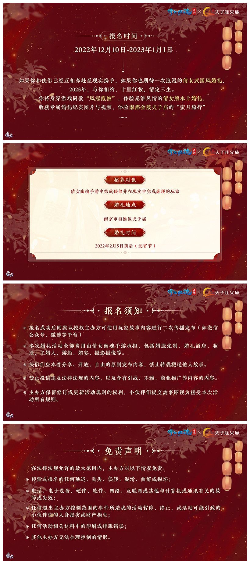 本次玩家集体婚礼报名时间为2022年12月10日-2023年1月1日,拟定于2023年2月5日元宵节前后举办,为预留充裕的沟通与定制化筹备时间,数量有限,先报先得!若你与侠侣已经互相奔赴,从三生湖走到秦淮河畔,亦可以通过参与唯美浪漫的国风集体婚礼,向三界有情人传递出爱与美好祝福!有意向的小伙伴们速速前来报名吧!