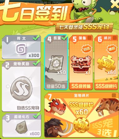 七日奖励:第一天签到300符文,第二天签到自选SS宠物,第三天签到600个超净化石,第四天签到50张扭蛋劵,第五天签到1个自选SS级装备,第六天签到60个随机SSS碎片,第七天签到60个SSS随机碎片和1个3选1的SSS宠物,这七天的福利相当于来说非常良心的,只要玩家们每天上线签到一下就可以领取,所以小伙伴们不要漏签了哦!活动时间奖励领完结束,这点是最最最让玩家们喜欢这款游戏的点吧!