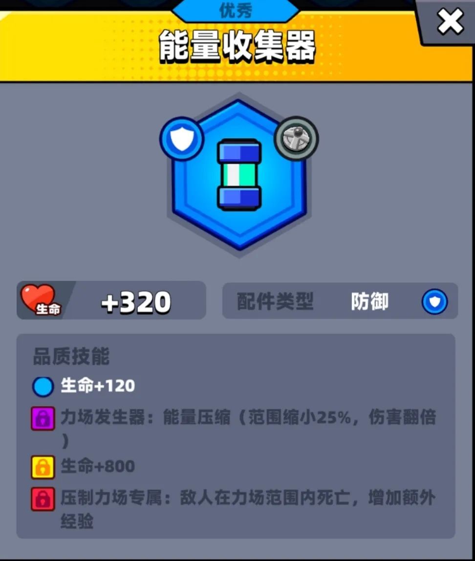 能量收集器这个科技配件对应的是力场发生器这个技能的专属科技,力场在局内是不错的,但是它没有什么伤害,但是在搭配这个科技之后,在达到紫色品质的时候虽然会导致范围会缩小25%,但是会伤害翻倍,在升级为红武的时候会成为超武压制力场,本身就可以使怪减速,搭配这个科技红武的时候还可以让敌人在力场的范围内死亡自身获得额外的经验。