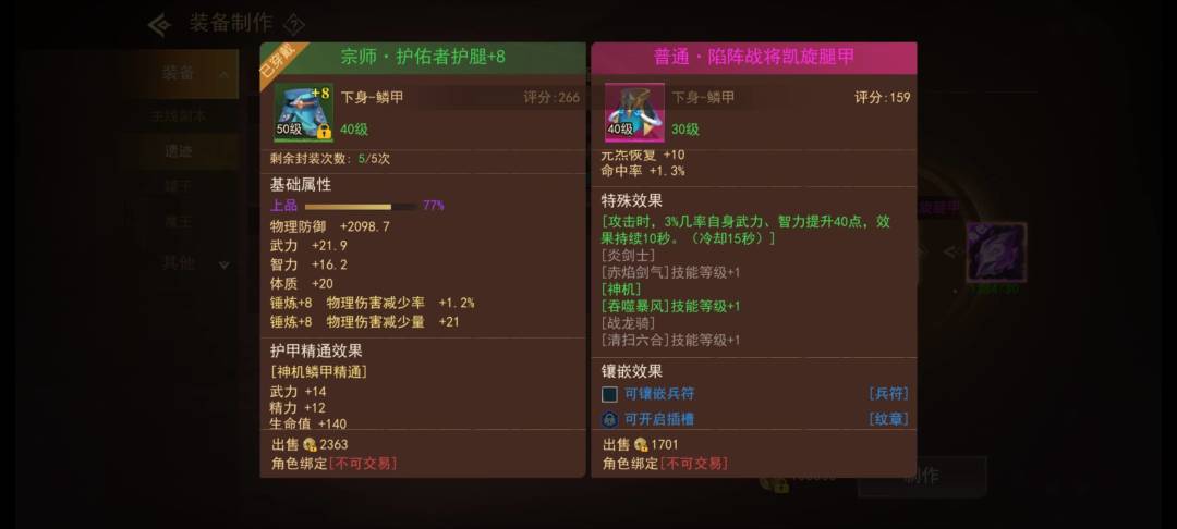 所谓的2+2也就是我们只保留两件套装的属性,选择两件40遗迹+两件50遗迹或者两件50遗迹+两件噩梦遗迹,当然噩梦遗迹比较难升级,所以一般建议两件40+两件50。我们只保留两件套属性,也就是只叠力量和智力,直接提升自己的伤害,换来的是血量和蓝量以及防御略低,无伤大雅。(ps:40的遗迹裤子和50的遗迹衣服加40技能,2+2的时候可以选择,有条件可以将两件40换成宗师套,区别不大,有略微提升。)至于衣服为什么要带50史诗散件,我们看一看属性。