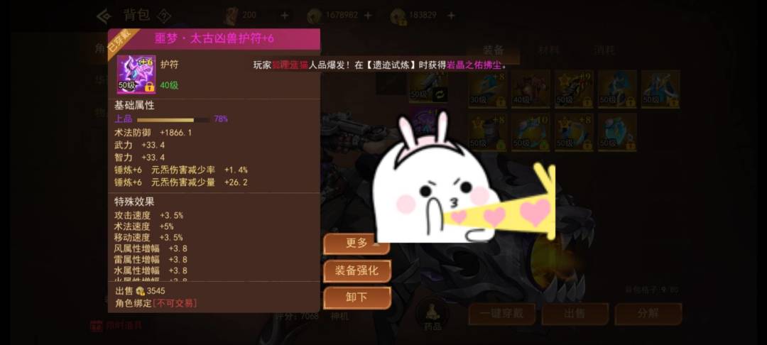 不知为何这张图片违规了,所以加了个兔兔!言归正传,50史诗散件的属性基本相同,也就是百十概率控制+附加百五伤害,对于我们刷图的生存空间,走位操作空间和伤害都有不错的提升!所以在散搭的时候是必须选择的!