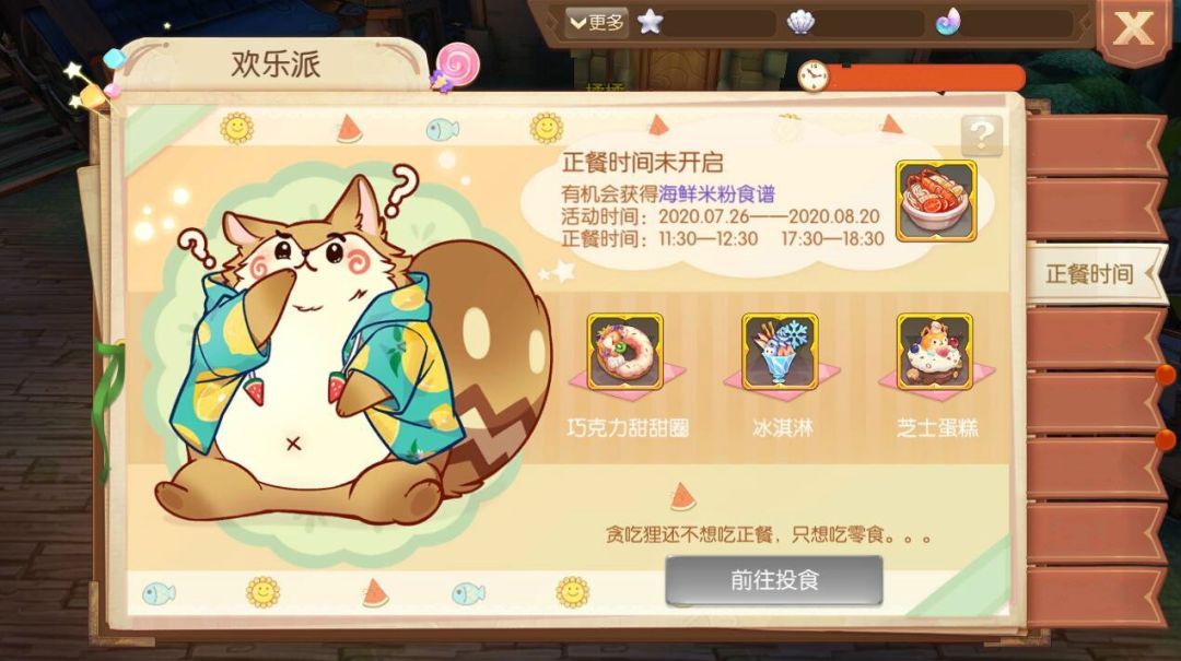 正餐玩法开启后,每日11:30-12:30、17:30-18:30为正餐制作时间,玩家可提交相应材料进行制作,卡卡会在正餐时间前20分钟想好要吃什么,大家可以提前准备制作材料;
