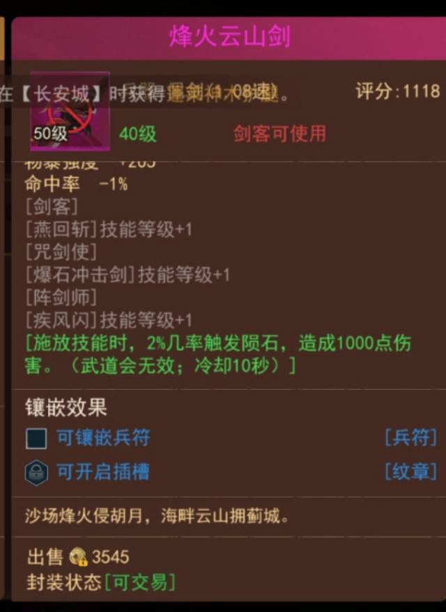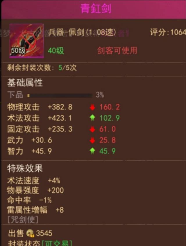 二、剑士篇阵剑士:暂无炎剑士:青釭剑、诛灭之剑咒剑士:烽火云山剑、神威龙鸣剑理由:阵剑目前拍卖行真的没见到太好的加阵法类型的武器,如果考虑辅助了医院呢西凉妖刀,如果考虑伤害可以选择青釭剑,不过都不是最优解。炎剑和咒剑推荐的装备都是50一把40一把,因为青釭剑和烽火云山剑比较贵,后面的诛灭之剑和神威剑虽然是40级别装备,不过也是极品属性装备,价格都在十万以内!