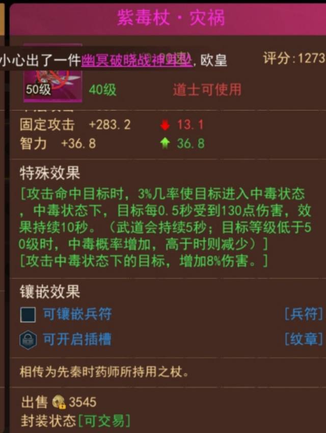 四、天师篇天师:素问无尘拂尘,大巫师的落雷王仗,紫毒仗·灾祸理由:落雷仗性价比最高,价格不高,换来两级大招和攻击特效。紫毒仗的缺点是和遗迹项链属性冲突,但是也是个好处,可以换个项链戴一戴。素问无尘拂尘可以给怪物很强的控制效果,但是拍卖行存货不多,都是比较极品的装备,不过考虑长期使用的话紫毒仗不建议用。