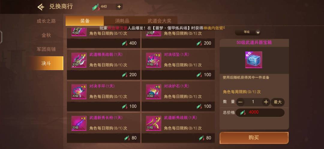 兑换商城有整级武器 并且强化8 虽然只有一天时效 但可以今天下午用到明天上午(算是一个武器用两天) 获取也很简单 每天5次PK