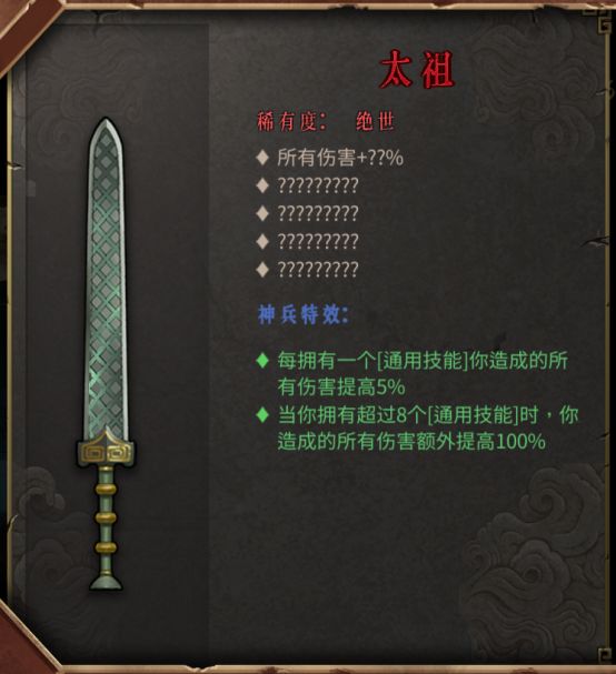 万兵之王——太祖,万金油到几乎除了个别流派(说的就是你飞剑)外都可以用上的武器。激活两个被动后至少稳定增加140%的所有伤害,且上不封顶。
