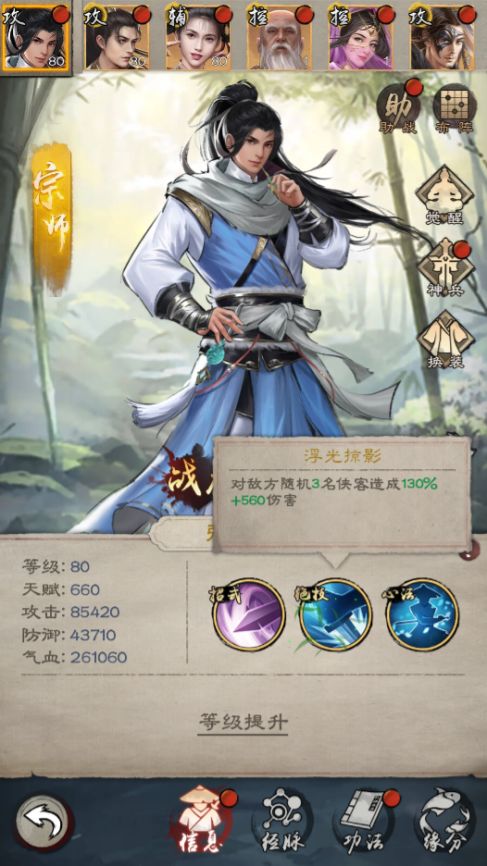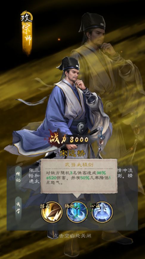 想要更快速地抢占战功排行领先优势,首先得有一个推图效率较高的群攻侠客,前期玩家推荐极限培养“宋远桥”(通关主线20幕可招募),这是前期宗师侠客中输出效率很高的侠客,绝技能同时攻击3个目标,还能有概率降低对手怒气值,可谓是推图利器。