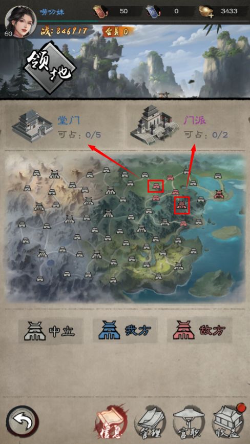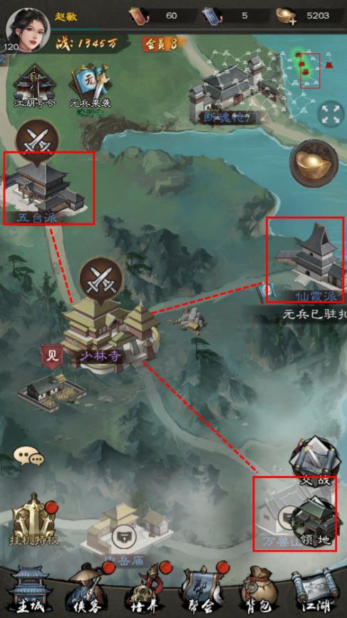 有了合适的侠客之后,大家就可以往想要攻占的门派投放队伍了,这里需要注意的是,门派或据点中的守军初始战力是不高的,一般就算是普通白嫖玩家一队援军都能刷2队甚至更多队的守军,但是攻占目标如果有玩家进入防守且战力与少主差不多,那就最好避其锋芒,选择另一个无玩家驻守的据点去刷,战功获取速度会更效率。