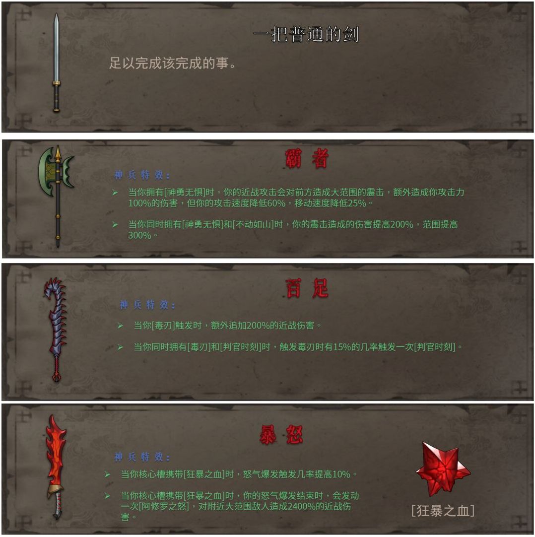 以上皆为当前版本所有神兵与其配合圣物,神兵之间各有千秋,至于专门的神兵选择我们留到Build篇来详聊。