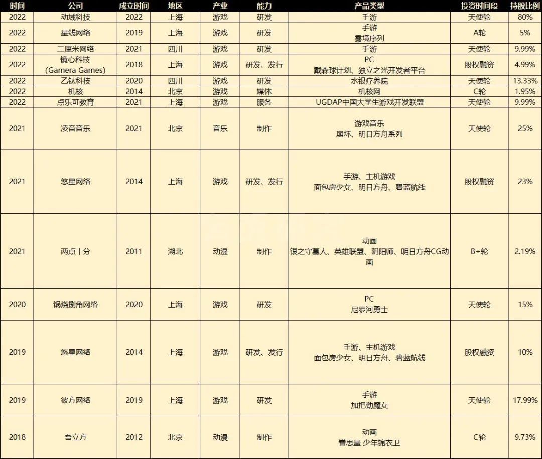在这些公司里,最老的是2011年成立的动画制作公司两点十分动漫,鹰角在2021年参与了其B+轮投资,目前持股比例约2.19%。最新的是成立于2022年的动域科技,鹰角在2022年中旬对其做了一轮天使轮投资,目前持股比例约80%。