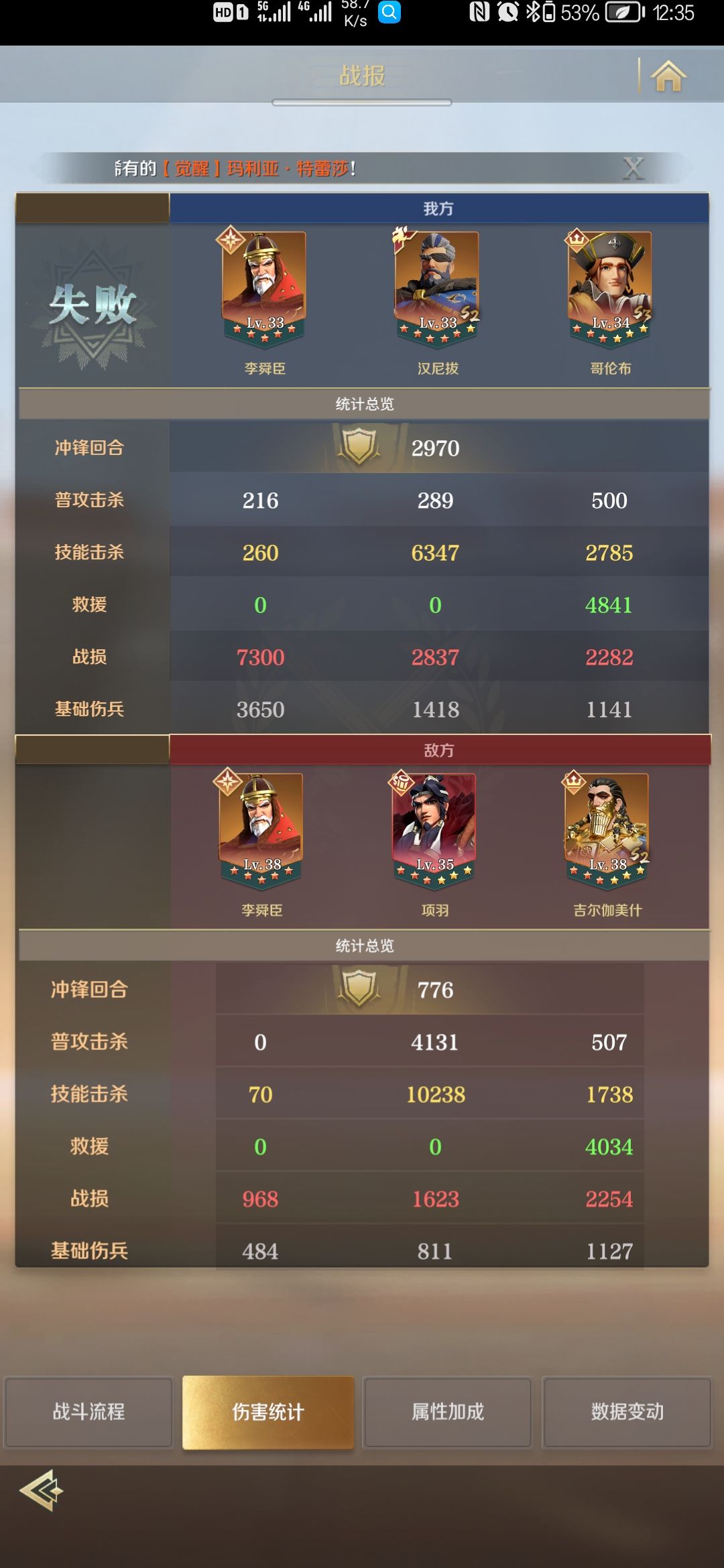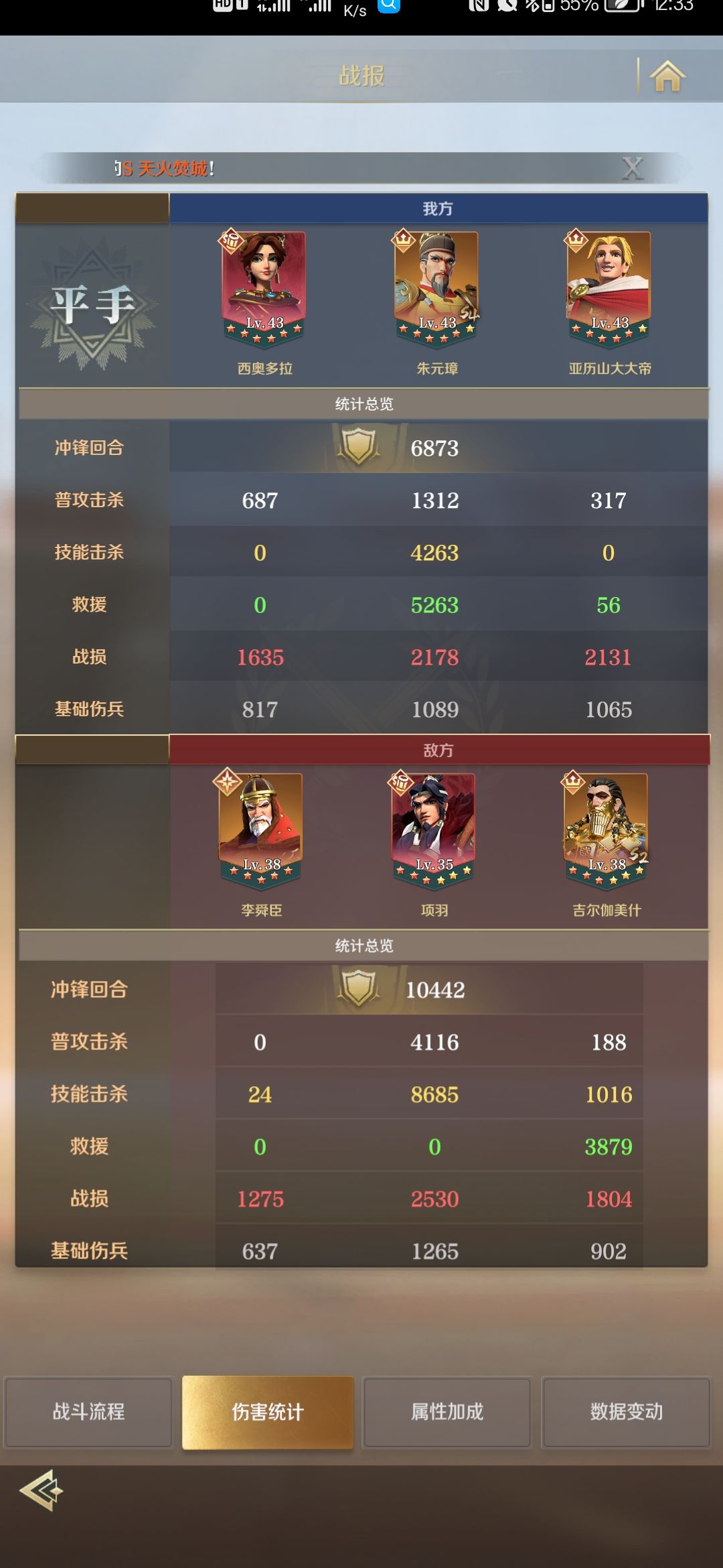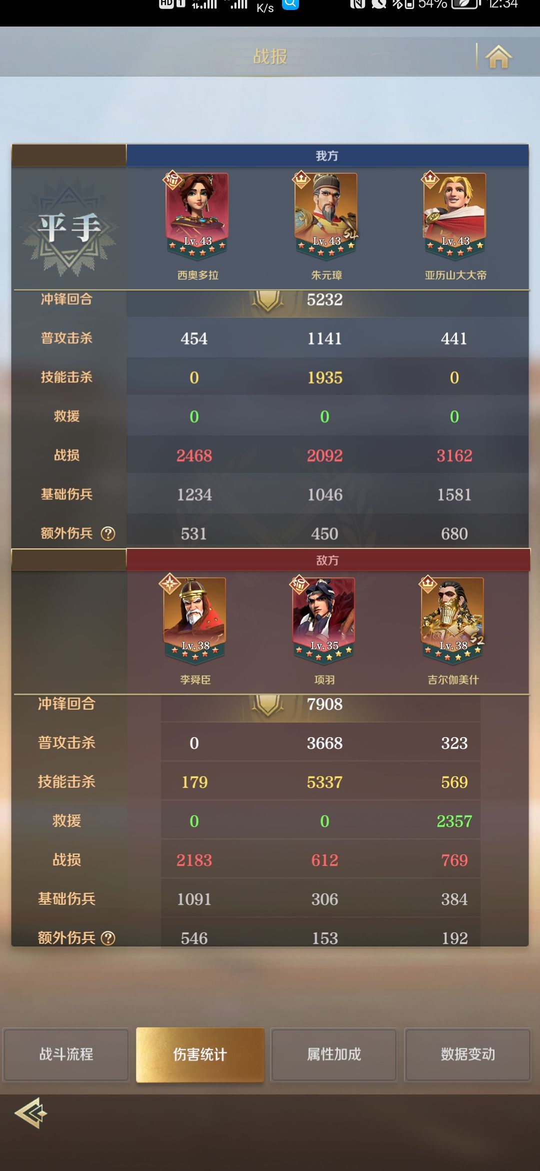 上图可以看到西奥多拉队无论红度还是技能都比酒馆项羽队豪华但是哑火了,技能一点伤害没有,直接罚站到结束,这队核心就在项羽自带巨鹿之战在控制敌方就概率发动技能,发动次数来打出伤害,唯一缺点就是技能伤害稍微有点低,但是不影响克制西奥队,上图,一串二也足以证明这队还是有实力的!