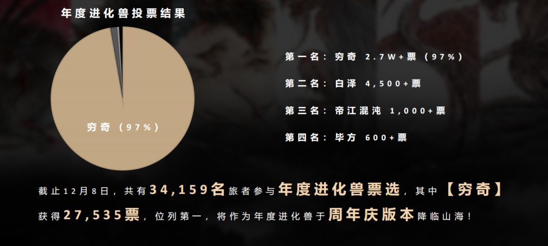 发布会的第一个环节,便是揭晓年度进化兽——经过旅者们历时一周的投票,穷奇最终以绝对领先的优势,夺得本次共创投票的冠军,成为本次二周年的年度进化兽!