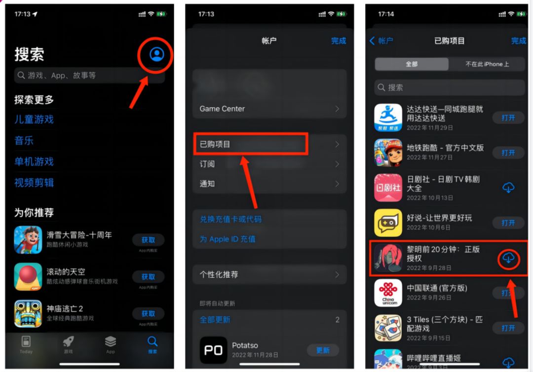 我们很遗憾《黎明前20分钟》iOS版本因平台原因被暂时隐藏-作为玩家的你,无法在中国区苹果商店搜到《黎明前20分钟》,目前我们还在积极跟中国区苹果商店官方沟通,希望尽快回复可见性。与此同时,我们也在定期更新iOS版本,如果你是在App Store已下载过《黎明前20分钟》的iOS玩家,你可以在App Store点击右上角“账户”,从 “已购项目”中找到《黎明前20分钟:正版授权》并选择右侧“下载”按钮,即可重新下载游戏(有概率会出现存档丢失问题-云存档成本过高,我们也在努力寻找更好的解决方案),具体操作页面如下图: