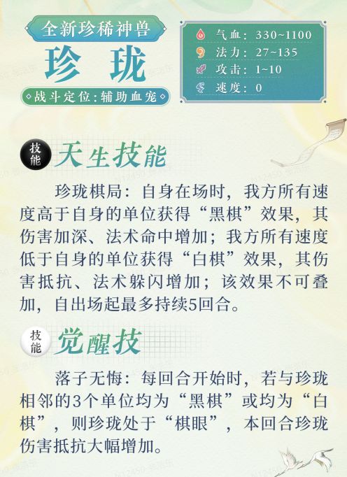 从数值和技能“珍珑棋局”、“落子无悔”来看,初值方面珍珑的气血量足足的,可中可负,灵活配速,妥妥的辅助血宠没错了。技能方面,对于当前版本的PK或者日常任务来讲,珍珑的加入,会让队伍打法思路广阔化,无论是敏队还是血队都是必不可少的召唤兽。敏队可用于纯血站桩,低敏破化无的同时既可以将队伍高敏单位的控制与输出提升到极致,又可以提升负敏男鬼对伤害和控制的抵抗能力,可谓是一举多得。血队或者中敏队可以选择将珍珑速度卡在男鬼前面,既能提升全队人物单位对伤害和控制的抵抗能力,又能帮男鬼卡敏吃化;也可以选择将珍珑压低速度,进一步提升血队或中敏队的伤害和控制,进可攻退可守,简直是实打实的多面手!