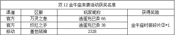 《世界OL》双12金牛座来袭活动获奖名单