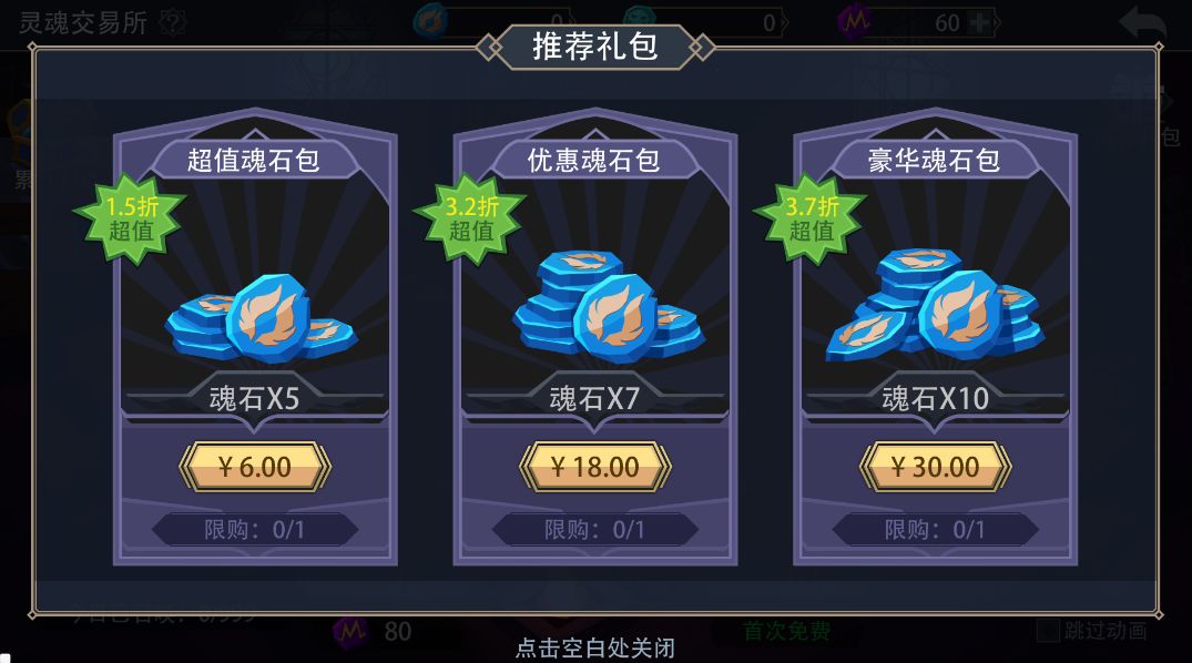 (1)超值魂石礼包:魂石*5,售价:6元;