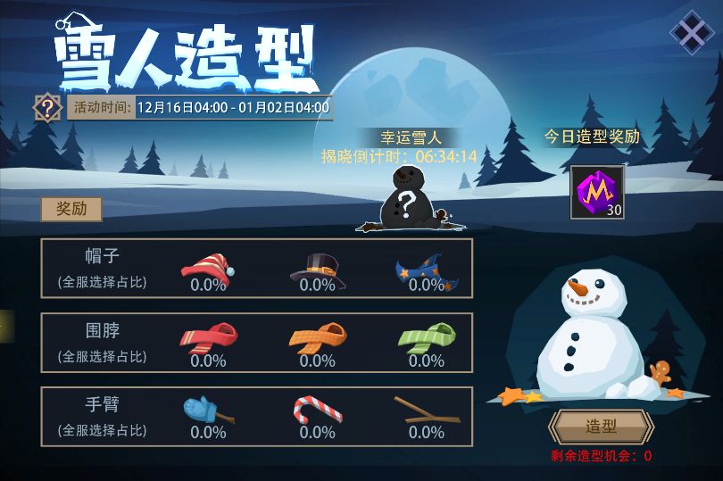 活动内容:活动期间,每日击败精英或首领,可以获得一次造型机会。此时可选择“帽子”、“围脖”、“手臂”来装饰你的雪人,可获得造型奖励。每日24:00时,系统会自动揭晓当日“幸运雪人”;还会根据你的雪人的相似部分来发放额外的奖励。
