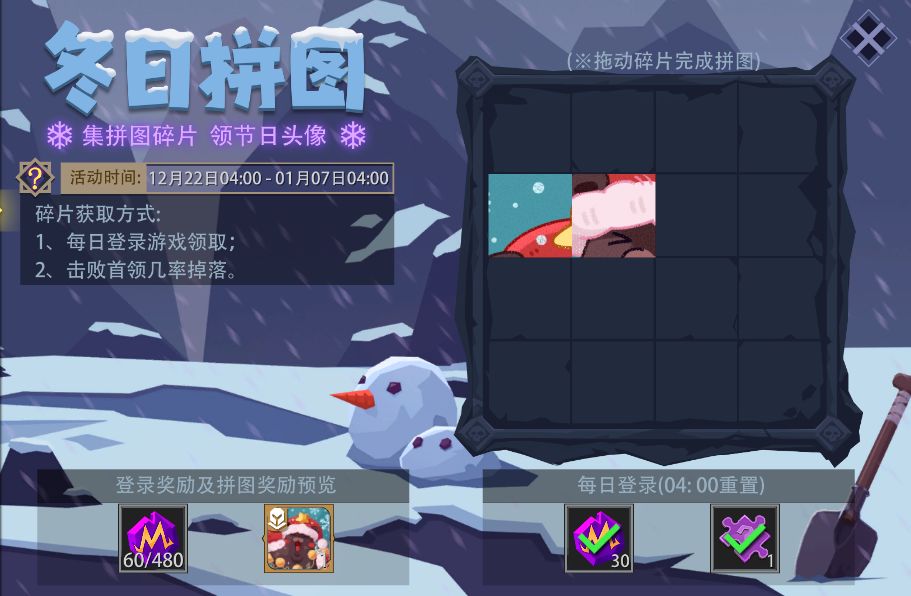 活动内容:每日登录游戏可领取魔晶及随机拼图碎片奖励。另外,在冒险/梦魇模式下击败首领也有几率掉落拼图碎片。集齐所有拼图并拼凑完整,还可以获得限定冰雪节头像。