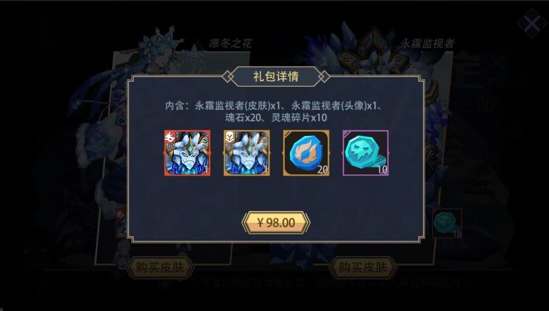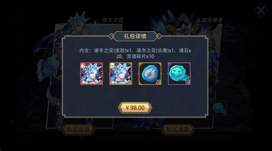 活动内容:冰雪节限定款皮肤【凛冬之花】和【永霜监视者】限时开放售卖,此2款皮肤仅可通过此页面进行购买,且活动结束后不进入商城和抽奖池。